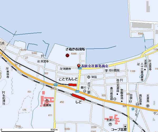 高松方面より国道11号線を徳島方面に進み、JR志度駅前交差点を北(海側)に入り